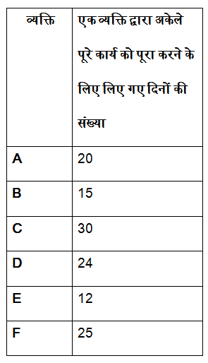 टेबल अलग-अलग व्यक्तियों द्वारा अकेले पूरे कार्य को पूरा करने के लिए लिए गए दिनों की संख्या को दर्शाती है।