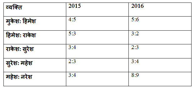2) यदि 2015 में मुकेश और हिमेश की मासिक बचत का संबंधित अनुपात 4: 5 है और 2016 में मुकेश और हिमेश की मासिक बचत का संबंधित अनुपात 2: 3 है, तो 2015 में मुकेश की मासिक बचत और 2016 में हिमेश की मासिक बचत का संबंधित अनुपात ज्ञात कीजिये। ।