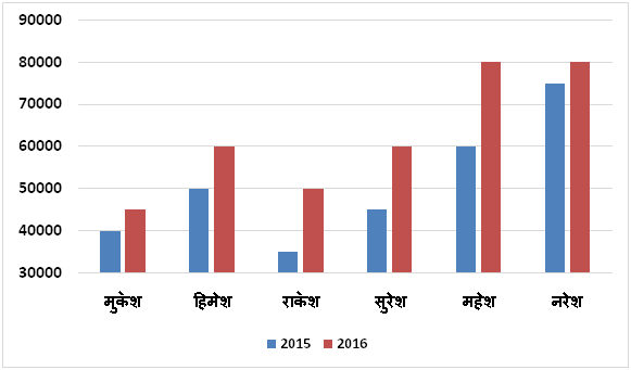 निम्नलिखित बार ग्राफ दो अलग-अलग वर्षों में छह व्यक्तियों की मासिक आय का प्रतिनिधित्व करता है: