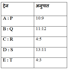 7) ट्रेन C, 36 सेकंड में 40 किमी / घंटा की गति के साथ विपरीत दिशा से आने वाली ट्रेन S को पार कर सकती है। तब ट्रेन C द्वारा ट्रेन P जो 32 किमी / घंटा की गति से समान दिशा में चल रही है को पार करने में लगने वाले समय और ट्रेन C द्वारा ट्रेन E जो की विपरीत दिशा में 44 किमी / घंटा की गति से चल रही हैं को पार करने में लगने वाले समय का संबंधित अनुपात ज्ञात करें।