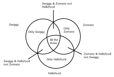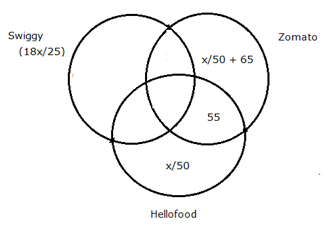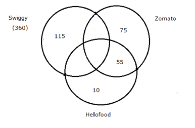 स्विगी, जोमाटो और हेलोफूड में निश्चित संख्या में लोग काम करते हैं। ऑनलाइन फूड डिलीवरी कंपनियों के केवल तीन प्रकार होते हैं और प्रत्येक व्यक्ति एक या अधिक कंपनियों में काम करता है। स्विगी कंपनी में काम करने वाले 72% और केवल हेलोफूड कंपनी में काम करने वाले लोग स्विगी कंपनी में काम करने वाले लोगों का 1/36 वें लोग थे। हेलोफूड कंपनी और जोमाटो दोनों में काम करने वाले लोगों की संख्या, लेकिन स्विगी कंपनी में नहीं , 55 हैं। केवल जोमाटो कंपनी में काम करने वाले लोग केवल हेलोफूड कंपनी में काम करने वाले लोगों की तुलना में 65 अधिक हैं। केवल स्विगी कंपनी में काम करने वाले लोग केवल जोमाटो कंपनी में काम करने वाले लोगों की संख्या से 160/3% अधिक हैं।