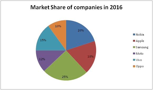 पाई-चार्ट वर्ष 2016 में विभिन्न कंपनियों द्वारा बेची गई मोबाइलों की बाजार हिस्सेदारी को दर्शाता है।