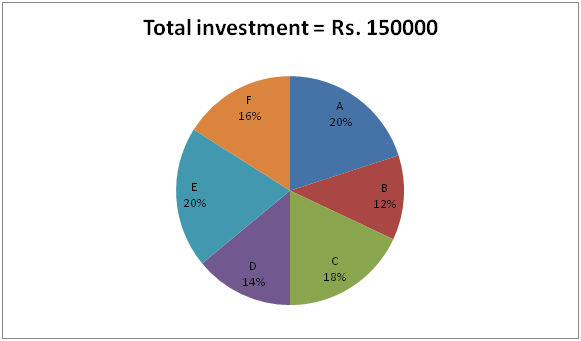 निम्नलिखित पाई चार्ट छह अलग-अलग व्यक्तियों के कुल निवेश का प्रतिशत वितरण दर्शाता है।