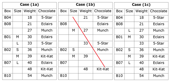 - At most three boxes are kept between the box B05 and the box B06, whose size is neither Small nor contains Kit-Kat, that means in case (1d) the box B06 is kept fifth from top and case (1a) is not valid.