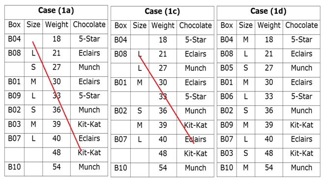 Case (1a) is not valid as at most three boxes are kept between the box B05 and the box B06 and case (1c) is not valid as no two box of same size are kept together.