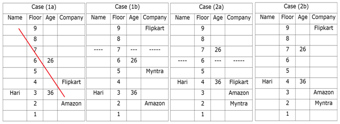 - Hari lives at a gap of one floor from the one who works in Myntra, who neither lives on lowermost floor nor adjacent to the one who works in Flipkart, that means in case (1b) the one who works in Myntra lives just below the one whose age is 26 years, in case (2a) the one who works in Myntra lives on floor just below the one who works in Amazon, in case (2b) since, neither the one who works in Flipkart nor the one who works in Amazon lives adjacent to vacant floors and two floors are vacant, thus the one who works in Myntra lives on floor just below the one who works in Amazon and case (1a) is not valid.