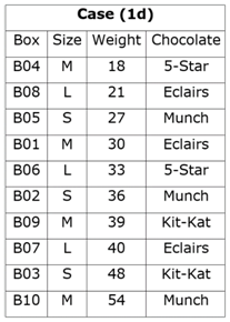 - Difference in weight of one of the Medium box and the box B06 is 21kg, since weight of the box B06 is 33kg, thus weight of one of the Medium box is (54 – 33) = 21kg, thus size of the box at bottom is Medium.