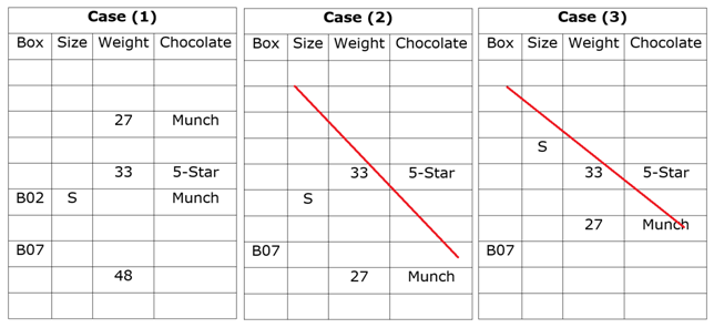 Case (2) & case (3) are not valid as the box whose weight is 48kg is kept at a gap of two boxes below the box B02.