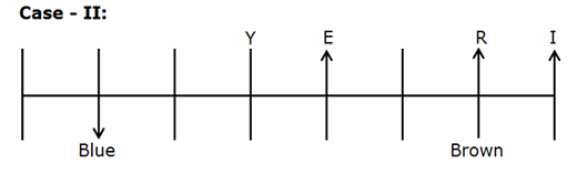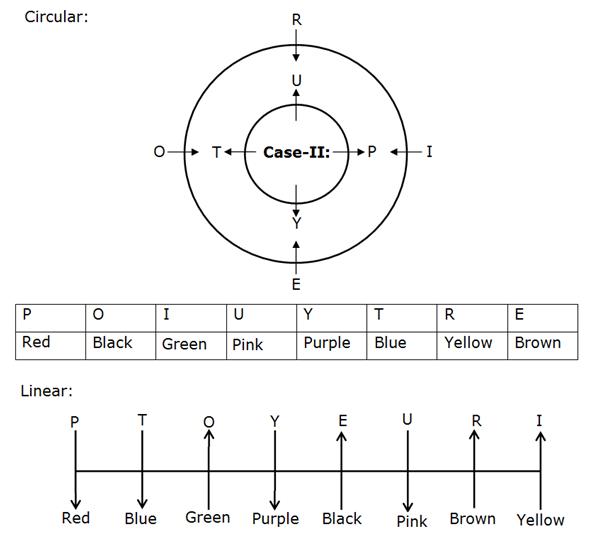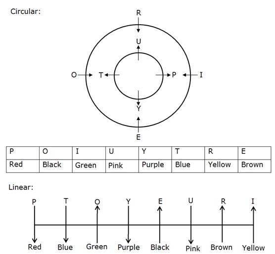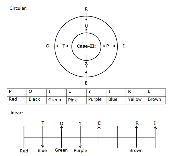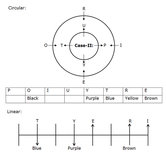 E, I और जो सीधी रेखा में नीला रंग पसंद है दोनों के बाएं से तीसरे स्थान पर बैठा है। I R का तत्काल पड़ोसी है और रेखा के अंतिम छोर पर बैठता है। व्रत में T का सामना करने वाला व्यक्ति, सीधी रेखा में हरा रंग पसंद करता है। U, व्रत में T के ठीक दाएं बैठता है। R पंक्ति के अंतिम छोर से दूसरे स्थान पर बैठता है और व्रत में E द्वारा पसंद किया गया रंग पसंद करता है। जो व्यक्ति पीला रंग को पसंद करता है वह उस व्यक्ति का सामना करता है जो व्रत में P के तत्काल बाएं बैठता है। E उस व्यक्ति का सामना करता है जो सीधी रेखा में तत्काल बाईं ओर बैठता है। जिस व्यक्ति को नीला रंग पसंद है, वह उस व्यक्ति का सामना करता है जिसे काला रंग पसंद है। R, E का तत्काल पड़ोसी नहीं है, जो व्रत में भूरा रंग पसंद करता है। R और P एक ही व्रत में एक-दूसरे का सामना नहीं करते या बैठते हैं। I उस व्यक्ति का सामना करता है जो Y के तत्काल बाएं बैठता है, जो बैंगनी रंग पसंद करता है। T और O एक दूसरे का सामना करते हैं; उनमें से कोई भी पीला रंग पसंद नहीं करता है। Y सीधी रेखा में नीला रंग पसंद करने वाले के बाईं ओर दूसरे स्थान पर बैठता है। P जब व्रत में बैठता है तो न तो नीला या गुलाबी रंग पसंद करता है। वह व्यक्ति, जिसे लाल रंग पसंद है, वह सीधी रेखा में हरा रंग पसंद करने वाले के बाईं ओर दूसरा स्थान पर बैठता है। E सीधी रेखा में पीले रंग पसंद नहीं करता है।