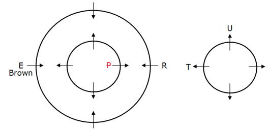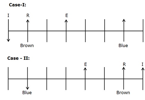 - R पंक्ति के अंतिम छोर से दूसरे स्थान पर बैठता है और व्रत में E द्वारा पसंद किया गया रंग पसंद करता है। इस कथन से, R और E बाहरी रेखा में रंगों की भिन्नता के कारण बैठता है और सीधी रेखा में उत्तर की ओर है।