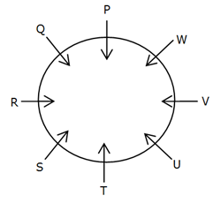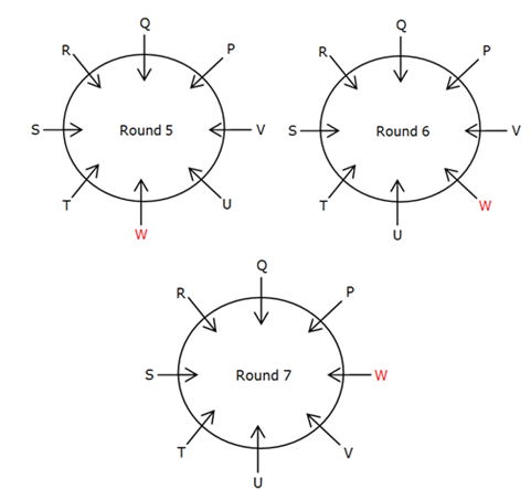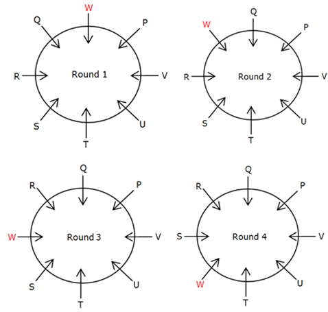 आठ मित्र – P, Q, R, S, T, U, V और W एक वर्ताकार मेज के चारों ओर एक ही क्रम में घडी की दिशा के विपरीत दिशा में बैठे हैं। वे सभी मेज के केंद्र की ओर का सामना कर रहे थे। वे सभी “पासिंग द बॉल” नामक एक खेल खेलते थे, जहाँ हर राउंड में गेंद दक्षिणावर्त दिशा में 15 स्थान पर जाती है। प्रत्येक राउंड के अंत में, जिस व्यक्ति ने राउंड शुरू किया और वह व्यक्ति जो अंतिम गेंद को प्राप्त करता है, अपने स्थान को इंटरचेंज करता है और अगले राउंड की शुरुआत पिछले राउंड में गेंद की अंतिम स्थिति से होती है। यह ज्ञात है कि W खेल शुरू करता है।