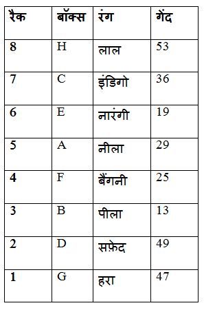 - बॉक्स H और नारंगी रंग के बॉक्स के बीच रखे गए बॉक्स की संख्या , बॉक्स B और हरे रंग के बॉक्स के बीच रखे बॉक्स की संख्या के समान हैं।