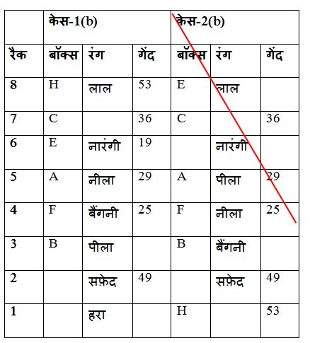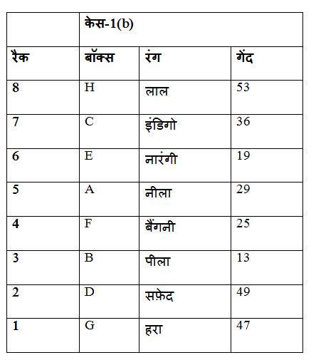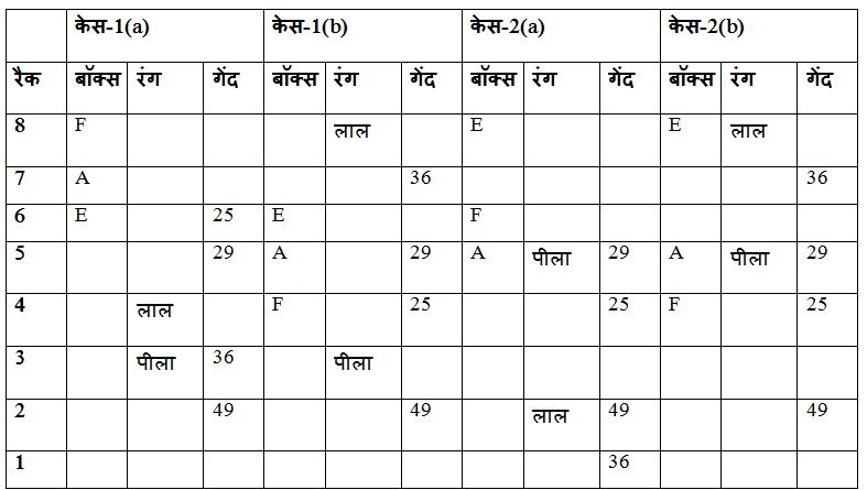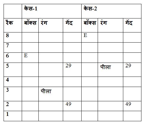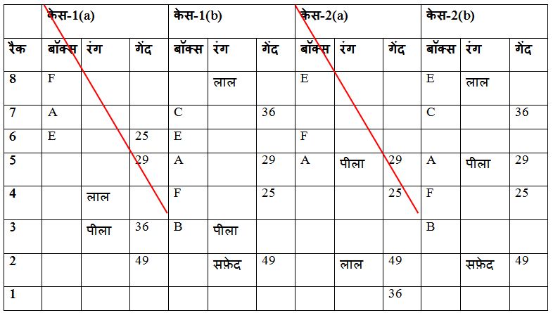 बॉक्स E और पीले रंग के बॉक्स के बीच दो बॉक्स रखे जाते हैं, जो विषम संख्या वाले रैक में से एक पर रखा जाता है, लेकिन सबसे नीचे रैक में नहीं। पीले रंग के बॉक्स को बॉक्स E के नीचे रखा जाता है। रैक 5 और रैक 2 पर रखे गए बॉक्स के बीच 20 गेंदों का अंतर होता है, जिसमें वर्ग गेंदों की संख्या होती है। बॉक्स F और लाल रंग के बॉक्स के बीच में तीन बॉक्स रखे जाते हैं, जिसे उस बॉक्स के ठीक ऊपर रखा जाता है, जिसमें 12 के गुणक में गेंदें होती हैं। बॉक्स F को सम संख्या रैक में से एक में रखा जाता है। दो बॉक्स को लाल रंग के बॉक्स और बॉक्स A के बीच रखा जाता है| बॉक्स A को उस बॉक्स के तत्काल ऊपर रखा जाता है जिसमें विषम संख्या में वर्ग गेंदें की संख्या होती हैं। सफेद रंग के बॉक्स को बॉक्स B के ठीक नीचे रखा जाता है। जितने भी बॉक्स सफेद बॉक्स के नीचे रखे जाते हैं, उतने ही बॉक्स बॉक्स C के ऊपर रखे जाते हैं। सफेद रंग के बॉक्स में उस बॉक्स की तुलना में केवल चार गेंद कम होती हैं, जिसमें अधिकतम गेंदों की संख्या होती है। H में गेंदों की अधिकतम संख्या है। नारंगी रंग के बॉक्स में बॉक्स A की तुलना में 10 गेंद कम है और एक सम संख्या रैक में रखे गए हैं। नीला रंग का बॉक्स बैंगनी रंग के बॉक्स के तत्काल ऊपर रखा गया है। बॉक्स H और नारंगी रंग के बॉक्स के बीच रखे गए बॉक्स की संख्या , बॉक्स B और हरे रंग के बॉक्स के बीच रखे बॉक्स की संख्या के समान हैं। पीले रंग के बॉक्स और बॉक्स D में गेंदों के बीच का अंतर बॉक्स C में गेंदों की संख्या के बराबर है। बॉक्स D को उस बॉक्स के ऊपर रखा जाता है जिसमें 47 गेंदें होती हैं।
