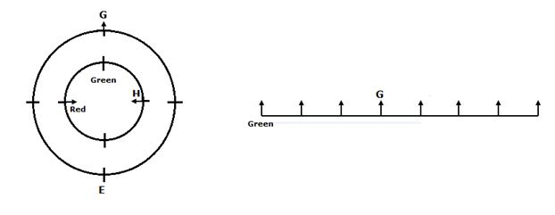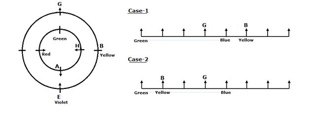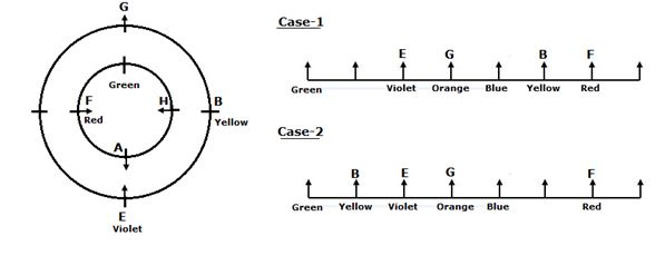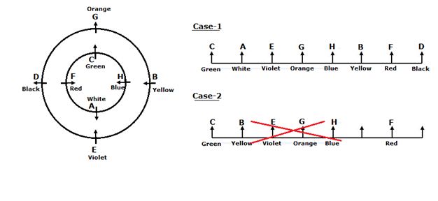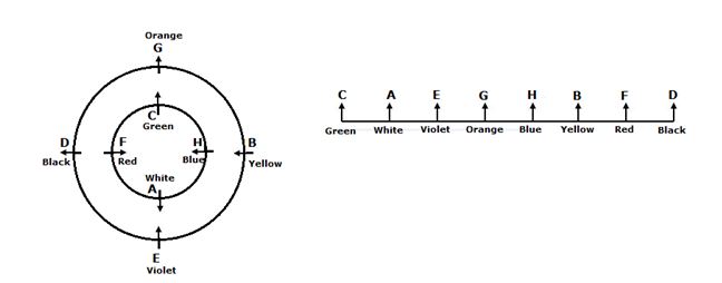 आठ व्यक्ति A, B, C, D, E, F, G और H दो वृत्तों में बैठे हैं जिन्हें आंतरिक वृत और बाहरी वृत्त का नाम दिया गया है। उनमें से चार प्रत्येक वृत में बैठे हैं, कुछ अंदर का सामना कर रहे हैं जबकि कुछ केंद्र से बाहर का सामना कर रहे हैं और प्रत्येक को अलग-अलग रंग पसंद हैं, जैसे कि, बैंगनी, नीला, हरा, पीला, नारंगी, लाल, काला और सफेद, लेकिन आवश्यक नहीं है वही अनुक्रम में हैं । और वे सभी उत्तर की ओर मुख किए सीधी पंक्ति में समान दूरी के साथ बैठाए जाते हैं। यदि किसी को कोई एक रंग पसंद है, तो वह व्यक्ति दोनों व्यवस्थाओं में रंग नहीं बदलेगा। जो व्यक्ति आंतरिक वृत्त में बैठे हैं, वे एक दूसरे के बीच समान दूरी के साथ बैठे होते हैं और बाहरी वृत्त में बैठे व्यक्तियों के बिल्कुल विपरीत बैठते हैं।