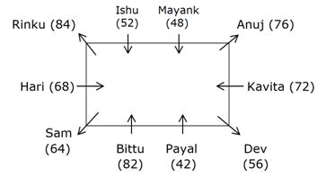 दस व्यक्ति अर्थात् – मयंक, रिंकू, बिट्टू, पायल, ईशू, देव, कविता, हरि, सैम और अनुज एक आयताकार मेज के चारों ओर इस तरह बैठे हैं कि प्रत्येक छोटी भुजा पर एक व्यक्ति ,प्रत्येक बड़ी भुजा पर दो व्यक्ति और प्रत्येक कोने(शीर्ष) पर एक व्यक्ति बैठता है। चारों भुजाओं पर बैठे व्यक्तियों का मुख केंद्र की ओर है,जबकि चारों कोनों पर बैठे व्यक्तियों का मुख केंद्र से बाहर की ओर है। प्रत्येक व्यक्ति का वजन अलग-अलग जैसे: 42, 48, 52, 56, 64, 68, 72, 76, 78 और 84 किग्रा है। सभी जानकारी का इसी क्रम में होना आवश्यक नहीं है।