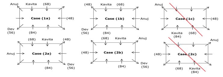 - कविता और देव जिसका वजन 56 किलो है, के बीच दो व्यक्ति बैठते हैं, इसका मतलब है कि स्थिति (1a)और स्थिति (1b) में, देव, वह जिसका वजन 84 किलोग्राम है, के तत्काल बाईं ओर बैठता है, स्थिति (2a) और स्थिति (2b) में,देव, वह जिसका वजन 84 किलोग्राम है, के तत्काल दाईं ओर बैठता है और स्थिति (1c) और स्थिति (2c) मान्य नहीं हैं।