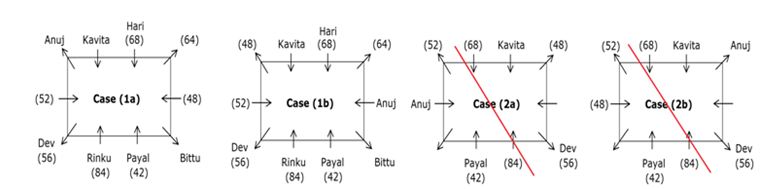 - वह जिसका वजन 84 किलो है, अनुज से दो स्थानों के अंतराल पर बड़ी भुजा पर बैठता है, इसका मतलब है कि हमारे पास अनुज के लिए चार संभावनाएं हैं,स्थिति(1a) और स्थिति(2b) में, अनुज कोने पर बैठता है, स्थिति (1b) और स्थिति (2a) में अनुज छोटी भुजा पर बैठता है।