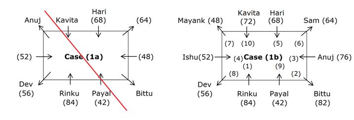 - क्योंकि पायल उस व्यक्ति से आसन्न नहीं बैठती है जिसका वजन 48 किलो है , इसका मतलब है कि स्थिति(1a) और स्थिति (1b) में,पायल वह जिसका वजन 84 किलोग्राम है के तत्काल दाईं ओर बैठती है और स्थिति (2a) और स्थिति(2b) मान्य नहीं है।