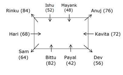 वह जिसका वजन 84 किलो है, अनुज जिसका वजन न तो 72 किलो है और न ही 64 किलो है, से दो स्थानों के अंतराल पर बड़ी भुजा पर बैठता है। वह जिसका वजन 52 किलो है, रिंकू के बाईं ओर से दूसरे स्थान पर बैठता है। वह जिसका वजन 48 किलोग्राम है और वह जिसका वजन 68 किलो है, के बीच एक व्यक्ति बैठता है। अनुज और 48 किलो के वजन वाले व्यक्ति जो न तो पायल के आसन्न बैठता है और न ही उसके आसन्न बैठता है जिसका वजन 84 किलो है, के बीच तीन व्यक्ति बैठते हैं। वह जिसका वजन 76 किलो है, ईशु जो न तो सैम और न ही 82 किलो के वजन वाले व्यक्ति के आसन्न बैठता है, की ओर मुख करके बैठता है। वह जिसका वजन 68 किलो है और कविता एक साथ बड़ी भुजा पर बैठते हैं। ईशू और वह जिसका वजन 72 किलो है, के बीच एक व्यक्ति बैठता है। या तो बिट्टू या हरि मेज के कोने पर बैठता है। पायल उस व्यक्ति से आसन्न नहीं बैठती है जिसका वजन 48 किलो है। बिट्टू और हरि जो 64 किलो वजन वाले व्यक्ति के आसन्न बैठता है, के बीच दो व्यक्ति बैठते हैं। कविता और देव जिसका वजन 56 किलो है, के बीच दो व्यक्ति बैठते हैं। वह जिसका वजन 52 किलो है, पायल जिसका वजन 42 किलो है, के बाईं ओर तीसरे स्थान पर बैठता है।