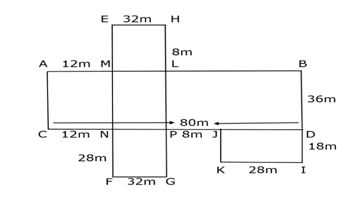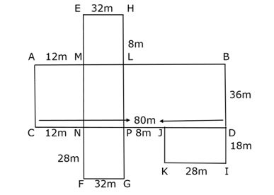 A, B, C और D आयताकार क्षेत्र के शीर्ष बिंदु हैं इस तरह से हैं कि A बिंदु B के पश्चिम में है। C, बिंदु A के दक्षिण में है। भुजा CD क्षेत्र की सबसे बड़ी भुजा है। बिंदु D, बिंदु I से 18 मीटर उत्तर में है। E, F, G और H एक अन्य आयताकार क्षेत्र के शीर्ष बिंदु हैं, जिसका क्षेत्रफल 2304 मी2 है इस तरह से कि क्रमशः रेखा EF रेखा AB, को M पर और रेखा CD,को N पर प्रतिच्छेदित करती है। बिंदु E, F के उत्तर में है। C, बिंदु N से 12 मीटर पश्चिम में है। ABCD के क्षेत्र की सबसे बड़ी भुजा की लंबाई 80 मीटर है। बिंदु I, बिंदु B के 54 मीटर दक्षिण में है। H, बिंदु E से 32 मीटर पूर्व में है। रेखा GH, आयताकार क्षेत्र को L और P पर प्रतिच्छेदित करती है। D, I, J और K एक अन्य आयताकार क्षेत्र है,इस तरह से कि बिंदु J, बिंदु P के 8 मीटर पूर्व में स्थित है। आयताकार क्षेत्र DIJK का क्षेत्रफल 504 मी2 है। बिंदु H से बिंदु L ,8 मीटर प्र है।