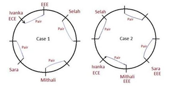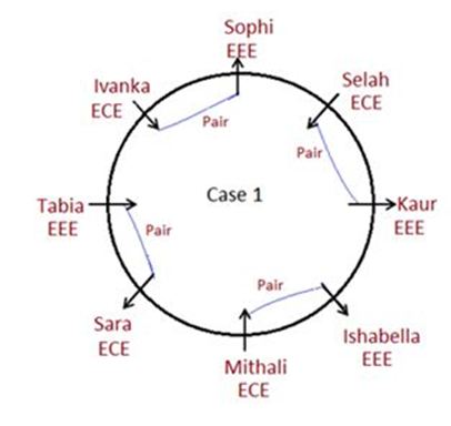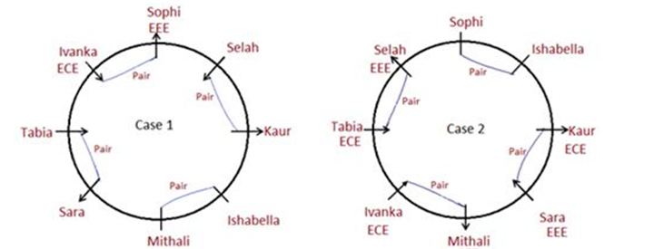 आठ व्यक्ति सोफी, सेला, कौर, तबिया, मिताली, सारा, इवांका, और इशाबेला एक दूसरे से समान दूरी के साथ एक गोल मेज पर बैठे हैं, जैसे कि उनमें से कुछ केंद्र की ओर और कुछ केंद्र के बाहर का सामना कर रही हैं। वे दो अलग-अलग विभागों ECE और EEE से संबंधित हैं और 4 समूहों की एक जोड़ी बनाते हैं। कोई भी जोड़ा एक ही विभाग का नहीं है। प्रत्येक जोड़ा एक साथ बैठा है और एक दूसरे के विपरीत दिशा का सामना कर रहे हैं।