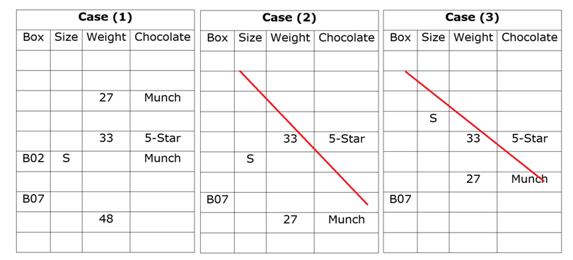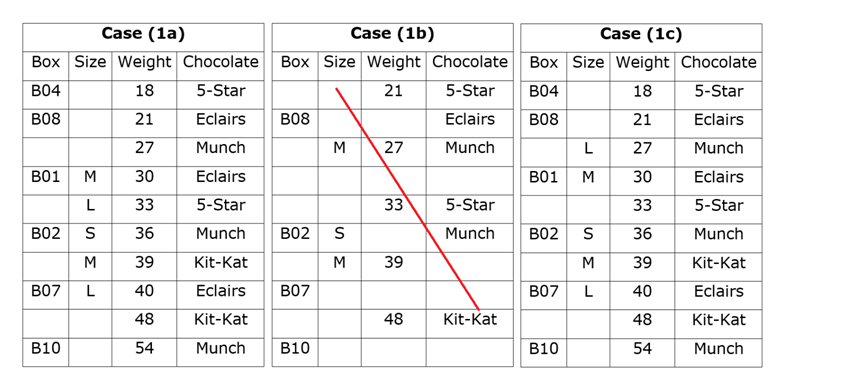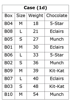 दस बक्से B01 से B10 तक स्टैक के रूप में एक दूसरे के ऊपर रखा जाता है। प्रत्येक बॉक्स का वजन या तो 3 या 5 का गुणक है के 4 किग्रा से 70 किग्रा के बीच है। बक्से या तो उनके वजन के आरोही या अवरोही क्रम में रखे जाते हैं। प्रत्येक बॉक्स का आकार अलग-अलग होता है जैसे लघु (S), मध्यम (M) और दीर्घ (L)। प्रत्येक आकार श्रेणी के तीन से कम और चार से अधिक बक्से नहीं हैं। प्रत्येक बॉक्स में अलग-अलग चॉकलेट शामिल हैं। 5-स्टार, मंच, किट-कैट और एक्लैर्स। बक्से में एक ही प्रकार के चॉकलेट दो से कम और तीन से अधिक नहीं होते हैं। एक ही तरह के दो बक्सों को एक साथ नहीं रखा जाता है। एक ही क्रम में सभी जानकारी हो ऐसा आवश्यक नहीं है।