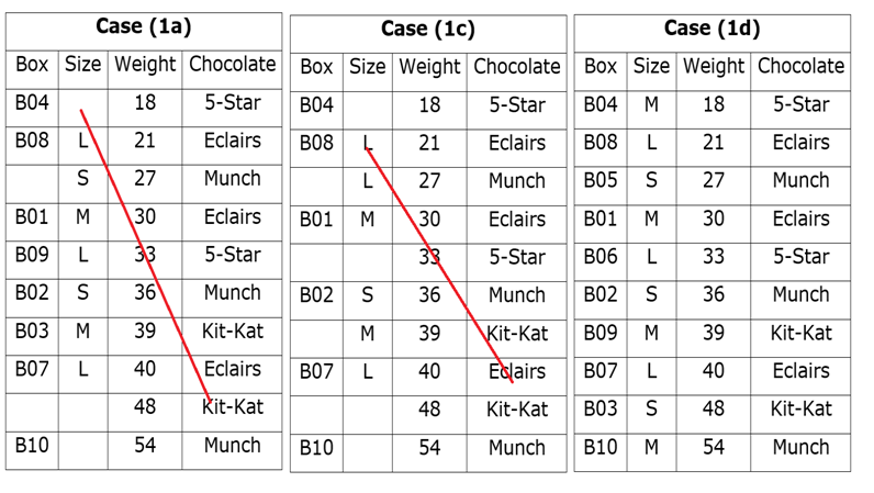 - किट-कैट वाले किसी भी बॉक्स को 5-स्टार वाले बॉक्स से निकट नहीं रखा जाता है। इसका ममंजिलब है कि मामले (1) में जिस बॉक्स का वजन 39 किलोग्राम है, उसे नीचे से चौथे स्थान पर रखा गया है।