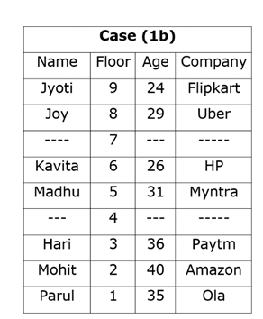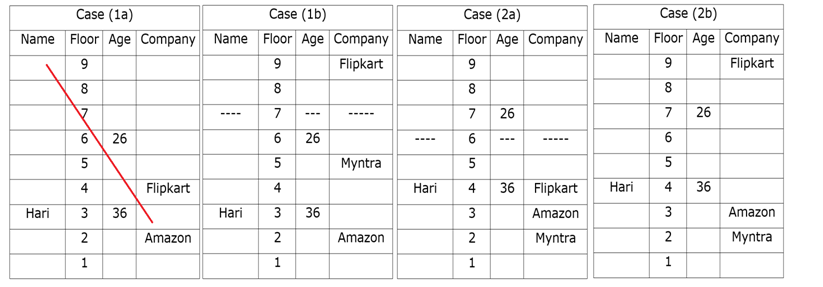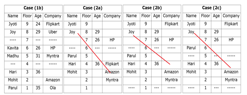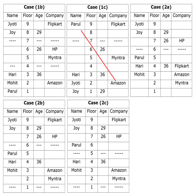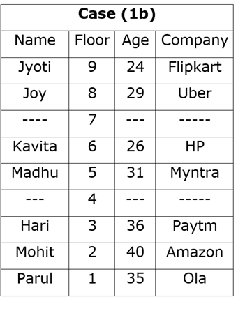 जो अमेज़न में काम करता है वह 1993 में पैदा हुए व्यक्ति के नीचे तीन मंजिल के अंतराल पर अभाज्य अंक वाली मंजिल पर रहता है। HP में काम करने वाले की आयु और ओला में काम करने वाले की आयु में अंतर 9 वर्ष है। हरी, मिन्त्रा में काम करने वाले से एक मंजिल के अंतर पर रहता है, जो न तो सबसे निचले मंजिल पर रहता है और न ही फ्लिपकार्ट में काम करने वाले के निकट है। कविता और मोहित के बीच आयु का अंतर सबसे अधिक 15 वर्ष है। ज्योति, जॉय के तत्काल ऊपर वाली मंजिल पर रहती है, जिसका जन्म 1990 में हुआ था। एक व्यक्ति फ्लिपकार्ट में काम करने वाले और 1993 में पैदा होने वाले व्यक्ति के बीच रहता है, जो न तो सबसे ऊपरी मंजिल पर रहता है और न ही हरी की मंजिल के पास रहता है। न तो फ्लिपकार्ट में काम करने वाला और न ही अमेज़न में काम करने वाला, खाली मंजिलों के समीप रहता है। पारुल न तो हरी के पास रहती है और न ही 1992 के बाद पैदा हुई है। 1995 में जो पैदा हुआ था, वह उबर में काम करने वाले के निकट वाली मंजिल पर रहता है। हरि की आयु 36 वर्ष है और जो अमेज़न में काम करता है उसके तत्काल ऊपर रहता है। जो फ्लिपकार्ट में काम करता है, वह पूर्ण वर्ग वाली मंजिल में रहता है। दो व्यक्ति मोहित, जिसका जन्म 1980 में नहीं हुआ था और HP में काम करने वाले व्यक्ति के बीच रहते हैं। दो व्यक्ति पारुल और मिन्त्रा में काम करने वाले व्यक्ति के बीच रहते हैं। जॉय जो न तो मिन्त्रा में काम करता है और न ही फ्लिपकार्ट में, और Hp में काम करने वाले के बीच कोई भी व्यक्ति नहीं रहता है। दो व्यक्ति उस व्यक्ति के बीच रहते हैं जिसकी आयु 31 वर्ष है और वह व्यक्ति जो ओला में काम करता है। एक व्यक्ति मधु और उबर में काम करने वाले के बीच रहता है।