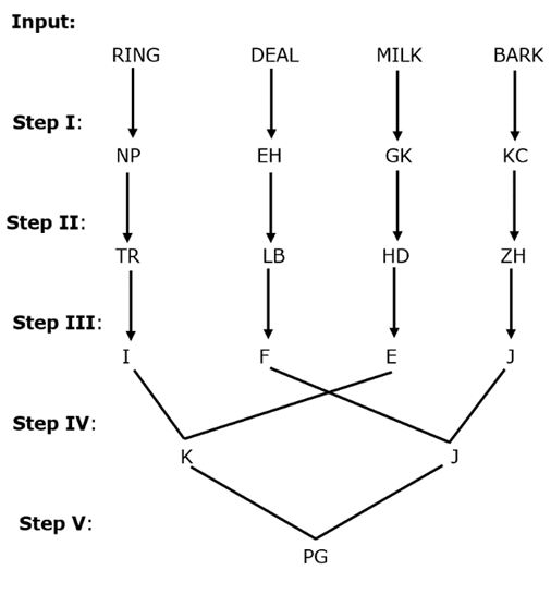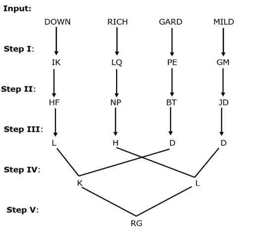स्पष्ट रूप से, चरण I में पहला अक्षर को पहले और तीसरे अक्षर के स्थान मान के योग से निर्धारित किया जा सकता है। इसी प्रकार, चरण I में दूसरे अक्षर को 2 वें और 4 वें अक्षर के स्थान मान के योग से निर्धारित किया जा सकता है।