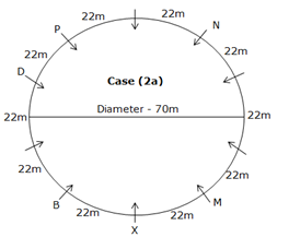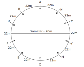 दस दोस्त A, B, C, D, M, N, P, R, X और Y 35 मीटर त्रिज्या वाले मैदान के ट्रैक में दौड़ के लिए अभ्यास करते हैं। ये सभी मैदान के केंद्र की ओर मुंह किए हुए हैं और दक्षिणावर्त दिशा में दौड़ने के लिए समान दूरी पर खड़े हैं।