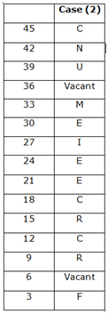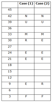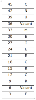 3 के पहले 15 गुणजों को नीचे से ऊपर की ओर लिखा जाता है। शब्द “CIRCUMFERENCE” के सभी अक्षर प्रत्येक संख्या के सामने लिखे गए हैं, लेकिन इसी क्रम में नहीं। दो संख्याओं के आगे अक्षर नहीं लिखे हैं। पदों 7 और 8 में ‘E’ को छोड़कर कोई भी एक ही अक्षर एक-दूसरे के बगल में नहीं रखे गए हैं और इन स्थितियों पर विचार किए बिना नीचे कुछ संकेत दिए गए हैं। दिए गए शब्द में मौजूद अक्षरों के अलावा कोई अन्य अक्षर दोहराया नहीं जाता है।