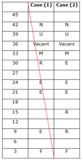 - R और R के बीच केवल एक अक्षर रखा गया है। दोनों को 7वें स्थान से नीचे विषम संख्या वाले स्थान पर रखा गया है, लेकिन सबसे निचले स्थान पर नहीं। खाली सीट U और M के बीच रखी गई है।