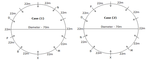 - B और M, X के तत्काल पड़ोसी हैं। परिधि पर B और D के बीच की दूरी 44 मीटर है, जबकि B, D के दाईं ओर खड़ा है। P, D का तत्काल पड़ोसी है।