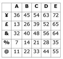 एक 5×5 मैट्रिक्स है जो सिग्नल को बना सकता है जो बदले में कुछ बल्बों की रोशनी में मदद करता है। मैट्रिक्स की पंक्तियों को @, %, &, £ और ¥ द्वारा नीचे से ऊपर तक एक ही क्रम में दर्शाया जाता है और कॉलम को A, B, C, D और E से बाएं से दाएं दर्शाया जाता है: