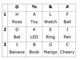 वर्णमाला क्रम में A से L के रूप में चिह्नित बारह बक्से को 3 x 4 मैट्रिक्स के रूप में रखा गया है। मैट्रिक्स की पंक्तियों को ऊपर से नीचे तक 1, 2 और 3 के रूप में दर्शाया जाता है और कॉलम को #, &, % और @ के रूप में एक ही क्रम में बाएं से दाएं के रूप में चिह्नित किया जाता है। ब्लॉक में बारह अलग-अलग वस्तु शामिल हैं। पेन, वॉच, एलईडी, खिलौने, बैट, बुक, रिंग, केला, चेरी, बॉल, गुलाब और आम। एक ही क्रम में सभी जानकारी आवश्यक नहीं है।