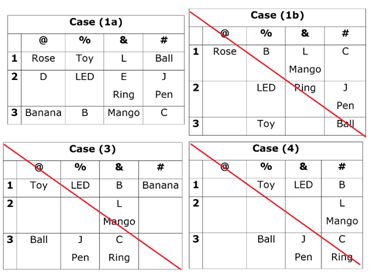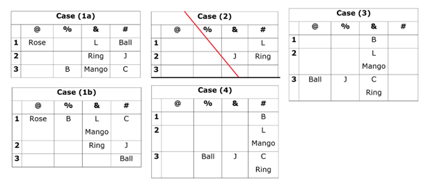 - केले वाले बॉक्स को बॉक्स B के आसन्न रखा जाता है, इसका मतलब है कि केस (1 B) और केस (4) मान्य नहीं हैं, अगर केस (1 A) में केला वाले बॉक्स को 3 @ पर रखा गया है, तो केस (3) में केले वाले बॉक्स वाले 1#पर रखा गया है।