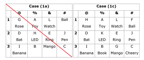 - बॉक्स K को बुक वाले बॉक्स और बॉक्स A के ठीक बीच में रखा गया है, इसका मतलब है कि केस (1a) में बॉक्स D में बैट है और बॉक्स H में एलईडी है, इस प्रकार मामला (1a) वैध नहीं है, केस (1c) में बॉक्स D में बैट है। और बॉक्स H में गुलाब होता है।