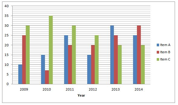 The bar graph shows the sales (in thousands) of Item A, Item B and Item C in a company: