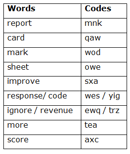 “report card mark sheet” is coded as “mnk wod qaw owe”