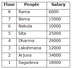 The person who earns highest amount of salary is living in floor number 2. Nakula lives in floor number Six. Sita earns Rs.25000. The persons who live above Bema earn less than Bema, who does not live in floor number 2. The difference between the salaries of Nakula and the person who lives in floor number 4 is 19000. Nakula earns less than the person who lives in floor number 4. Only two people lives between Dharma and Sagadeva. The person who lives immediately below Nakula earns 150% more than Nakula. Rama does not live any of the floors below Sita. Sagadeva does not earn second highest amount of salary. Bhema earns more than Lakshmana. The difference between the salaries of the person who lives in floor number 1 and Lakshmana is equal to Rama’s salary.