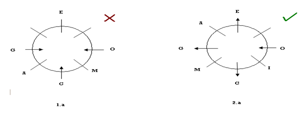 Both A and K face a direction opposite that of G. (i.e, if G faces the centre then both A and K face outward and vice versa).