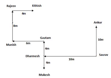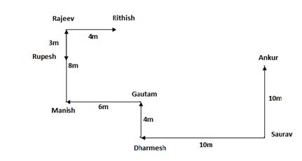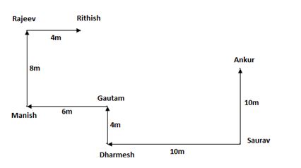 Ankur is 10m to the north of Saurav. Dharmesh is 10m to the west of Saurav and Gautam is 4m to the north of Dharmesh. Manish is 6m to the west of Gautam. Rajeev is 8m to the north of Maneesh. Rithish is 4m to the east of Rajeev.