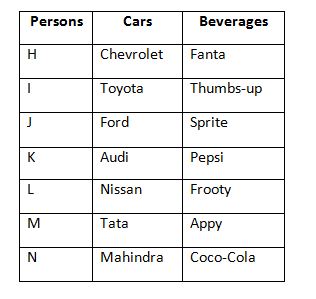 Seven friends H, I, J, K, L, M and N likes different beverages viz., Coco-Cola, Frooty, Fanta, Thumbs-up, Sprite, Pepsi and Appy but not necessary in the same order. Each friend is also has a different cars namely Tata, Nissan, Chevrolet, Ford, Audi, Toyota and Mahindra but not necessary in the same order.