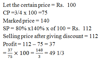 6) An article was purchase at a cost of 3/4 of certain price. It is marked 40% above the cost price and it was sold at 20% discount. Find the profit Percentage?
