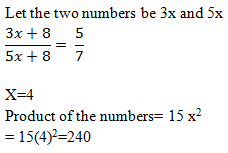 4) Two numbers are in the ratio 3 : 5. If 8 is added to each number, they will be in the ratio 5 : 7. What is the product of the two numbers?