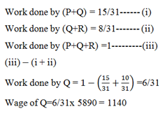 1) P, Q, R are employed to do a work for 5890. P and Q together finished 15/31 of work, and Q and R together 10/31 of work. Wage of Q, is–