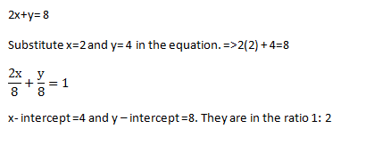 x- intercept =4 and y – intercept =8. They are in the ratio 1: 2