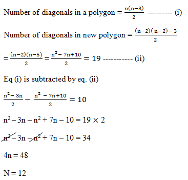 5) There is a regular polygon and if we reduce it’s no of sides by 2 then its number of diagonals reduced by 19 then how many sides does it have initially?