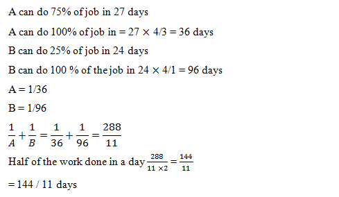 3) A can do 75% of a job in 27 days and B can do 25% of the job in 24 days. If they work on it together, in how many days can they do 50% of the job?