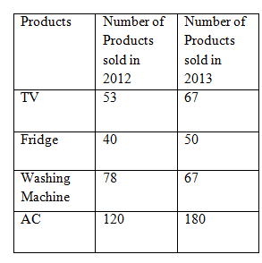 The sale of four different products in two different years of a electronics firm is given below in the following table chart. Study the chart and answer the following questions.